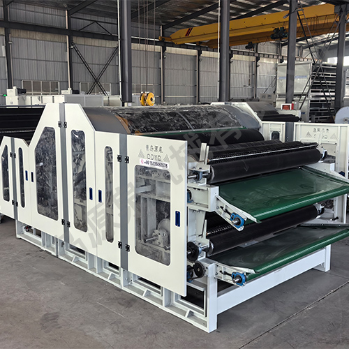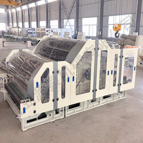 該機采用雙錫林梳理,雙道夫,雙雜亂出棉,雙羅拉剝棉,具有分梳能力強,梳理精度高等優點。喂入羅拉分上下兩組配對,變頻調速,并裝有金屬探測裝置,具有自停報警功能。且自動送入鋪網機斜簾,減輕操作工的勞動強度。